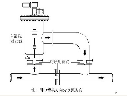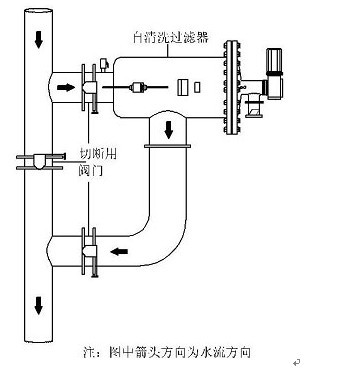 (6)安裝時(shí)應(yīng)考慮便于檢修,自清洗過濾器前后應(yīng)安裝關(guān)斷閥門,且應(yīng)安裝旁通管道。